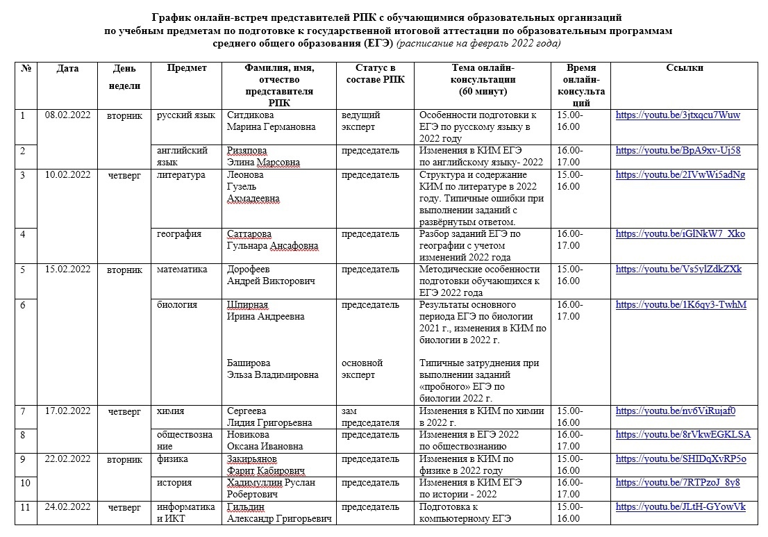 - ЕГЭ – каждый вторник и четверг с 15.00 ч. до 17.00 ч. (по графику с 8 по 24 февраля 2022 г.);