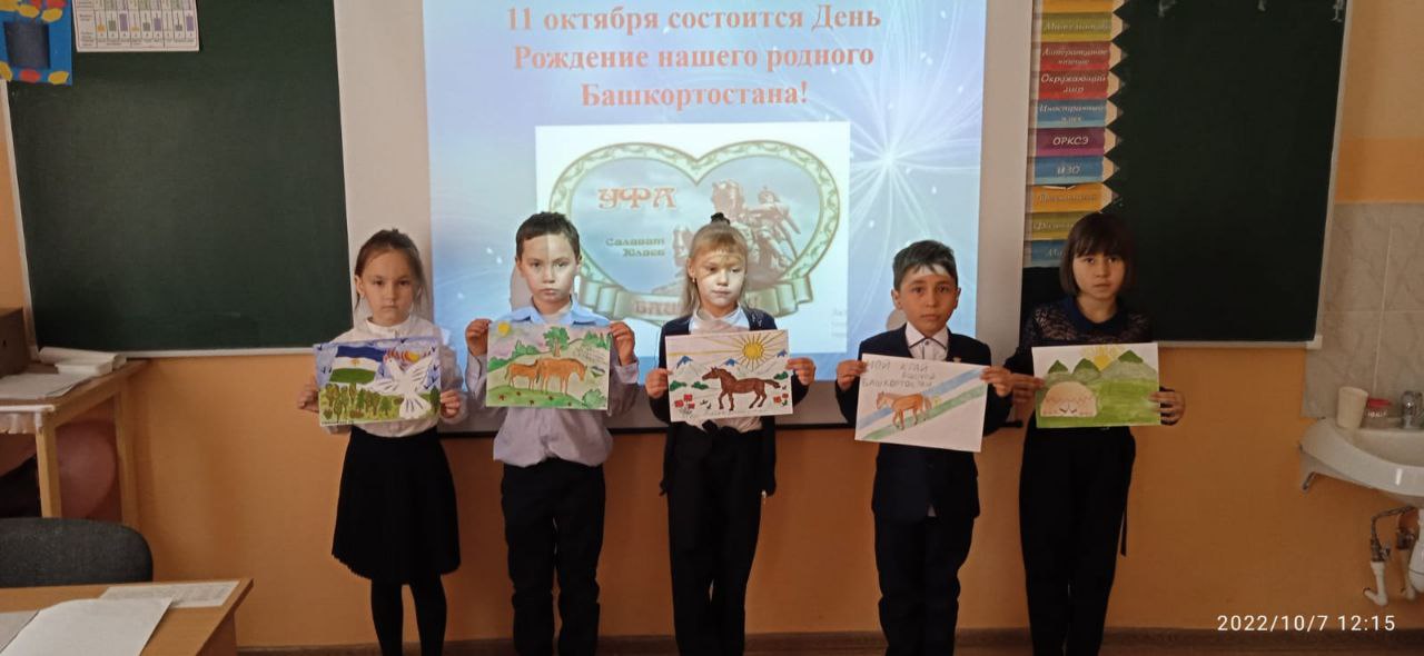 10 октября учитель башкирского языка и литературы Баймухаметова А.М. провела праздничное мероприятие «Мой край родной Башкортостан», посвященную ко Дню Республики Башкортостан. Учащиеся познакомились с историей РБ, символами. Звучали стихи, песни. В заключении ребята отвечали на вопросы викторины «Мой дивный край – Башкортостан».