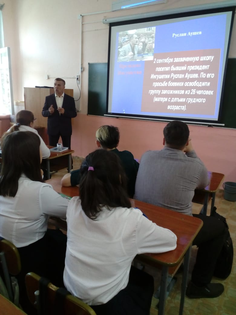 3 сентября в МБОУ СОШ №4 с.Раевский проведено мероприятие, посвящённое 14-й годовщине трагедии в Беслане. Учитель истории Аксёнов С.И. рассказал ребятам о страшных событиях, произошедших в школе №1 г.Беслан с 1 по 3 сентября 2004 года. Террористы захватили эту школу в самый торжественный день – 1 сентября. Более тысячи человек находилось в тот момент в школе. Никто не подозревал о готовящемся теракте. Жестокость боевиков не знала границ: они убивали взрослых и детей. В результате погибло 186 детей, 148 взрослых, из них 17 сотрудников школы, ранено около 700 человек. Об этом забывать нельзя.