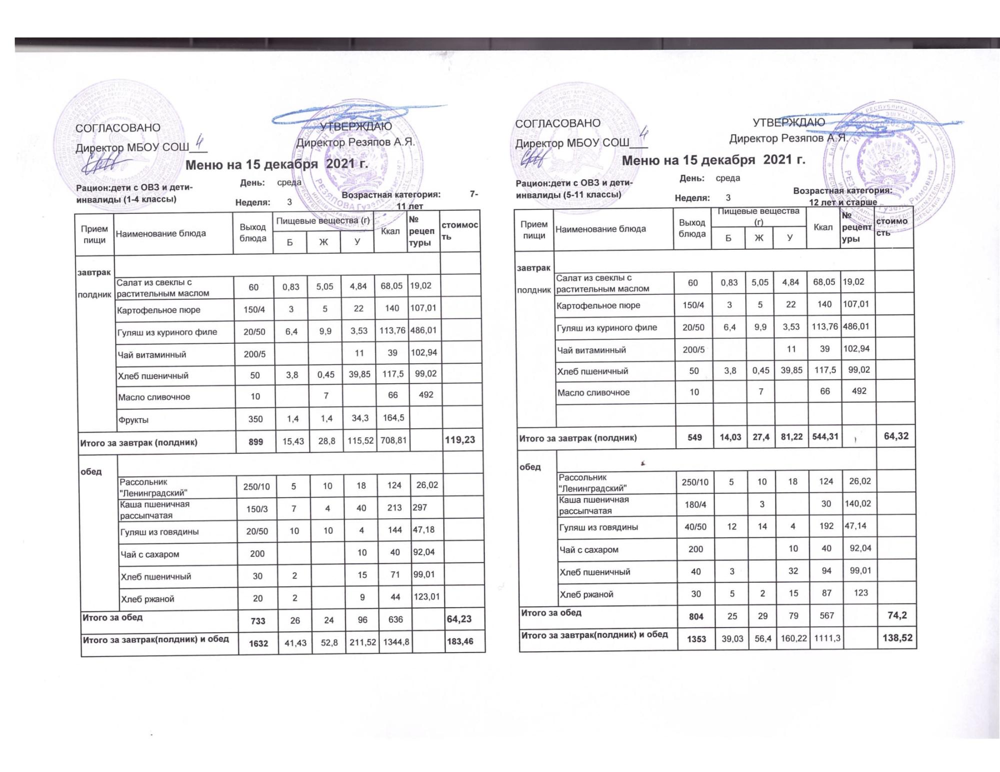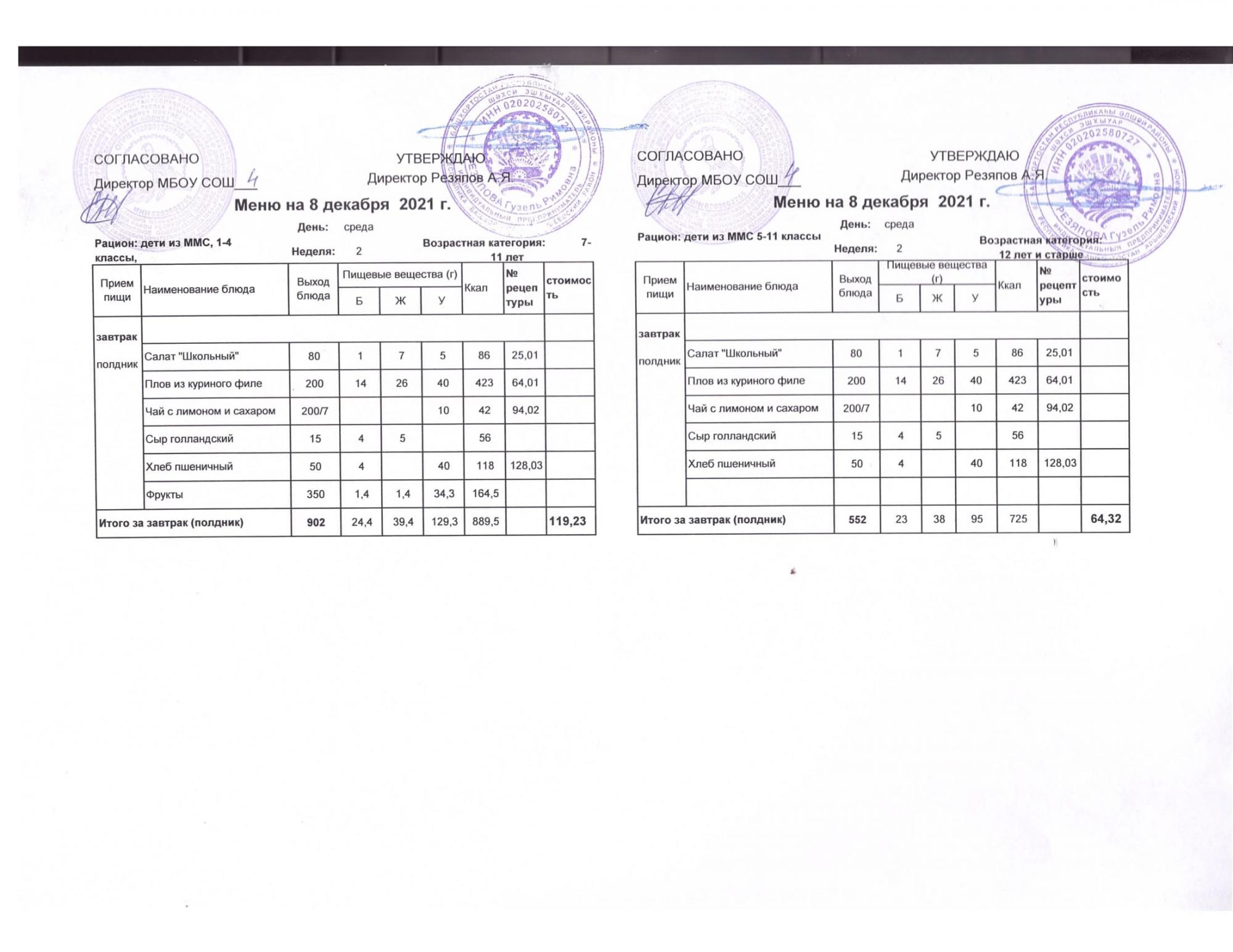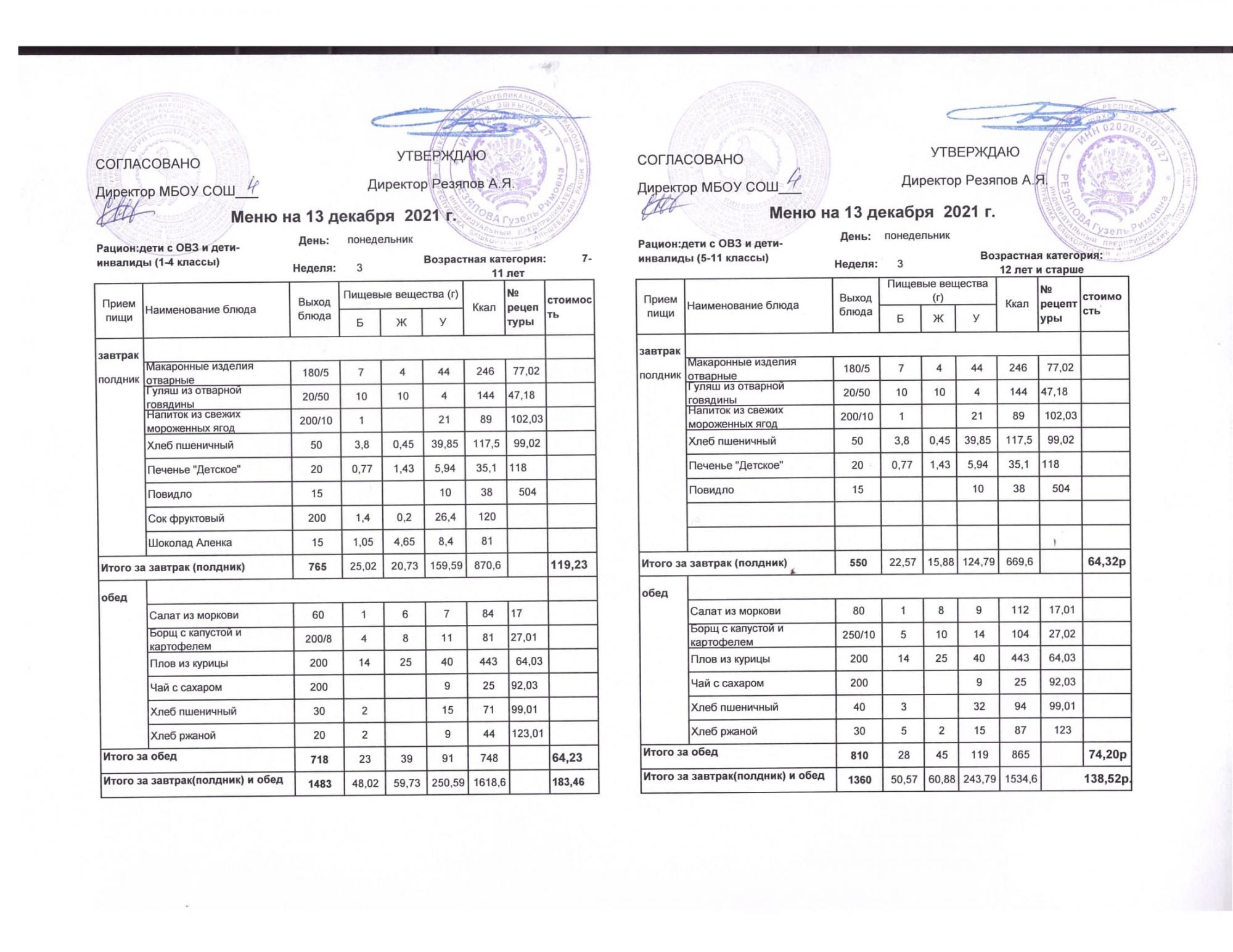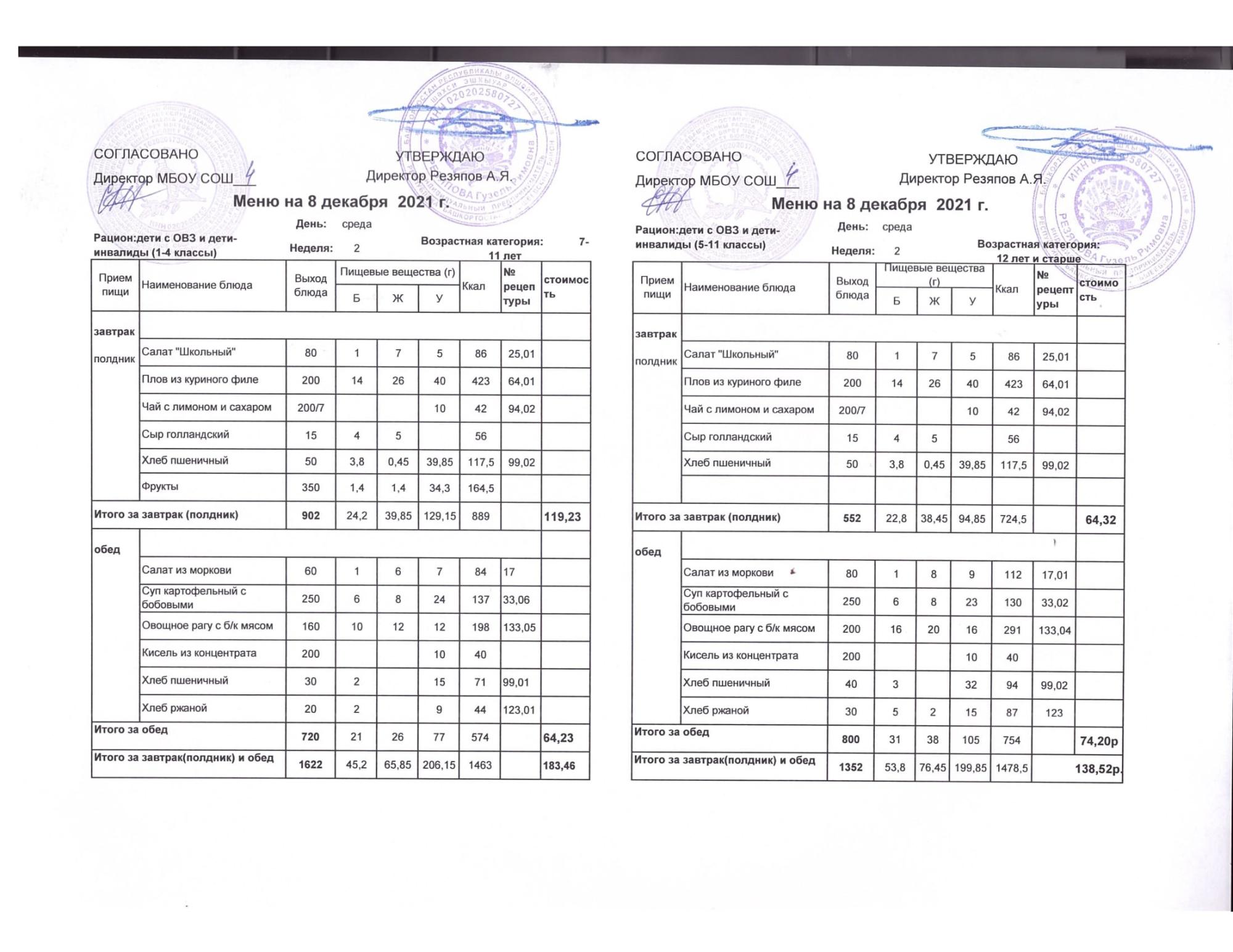 Стоимость школьного питания
