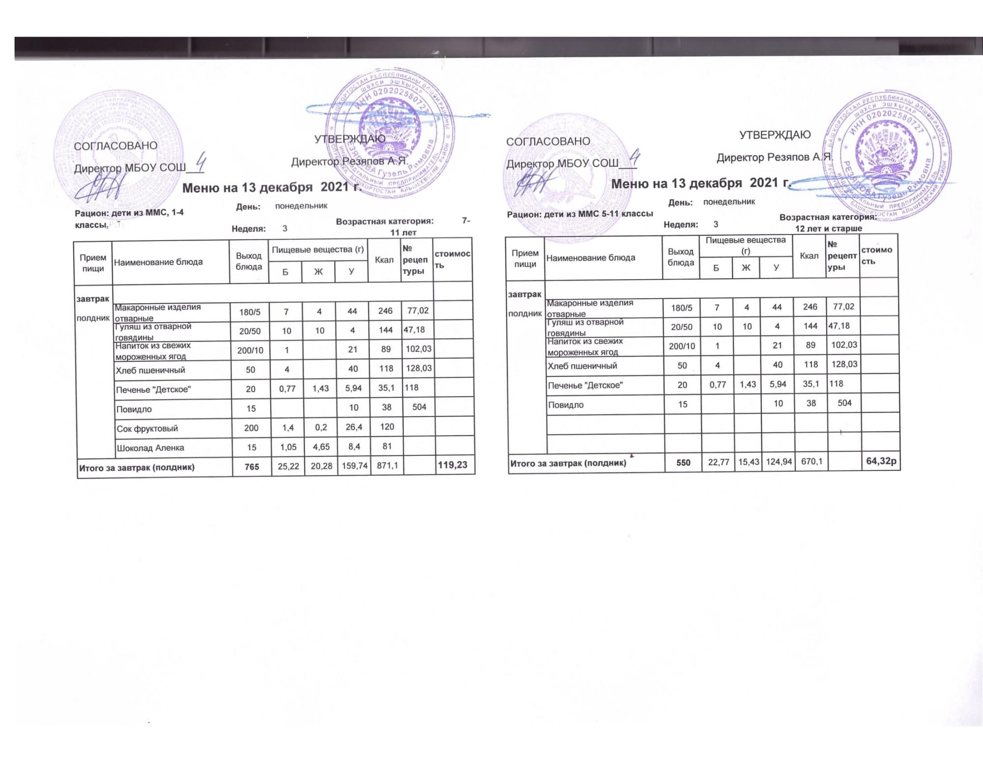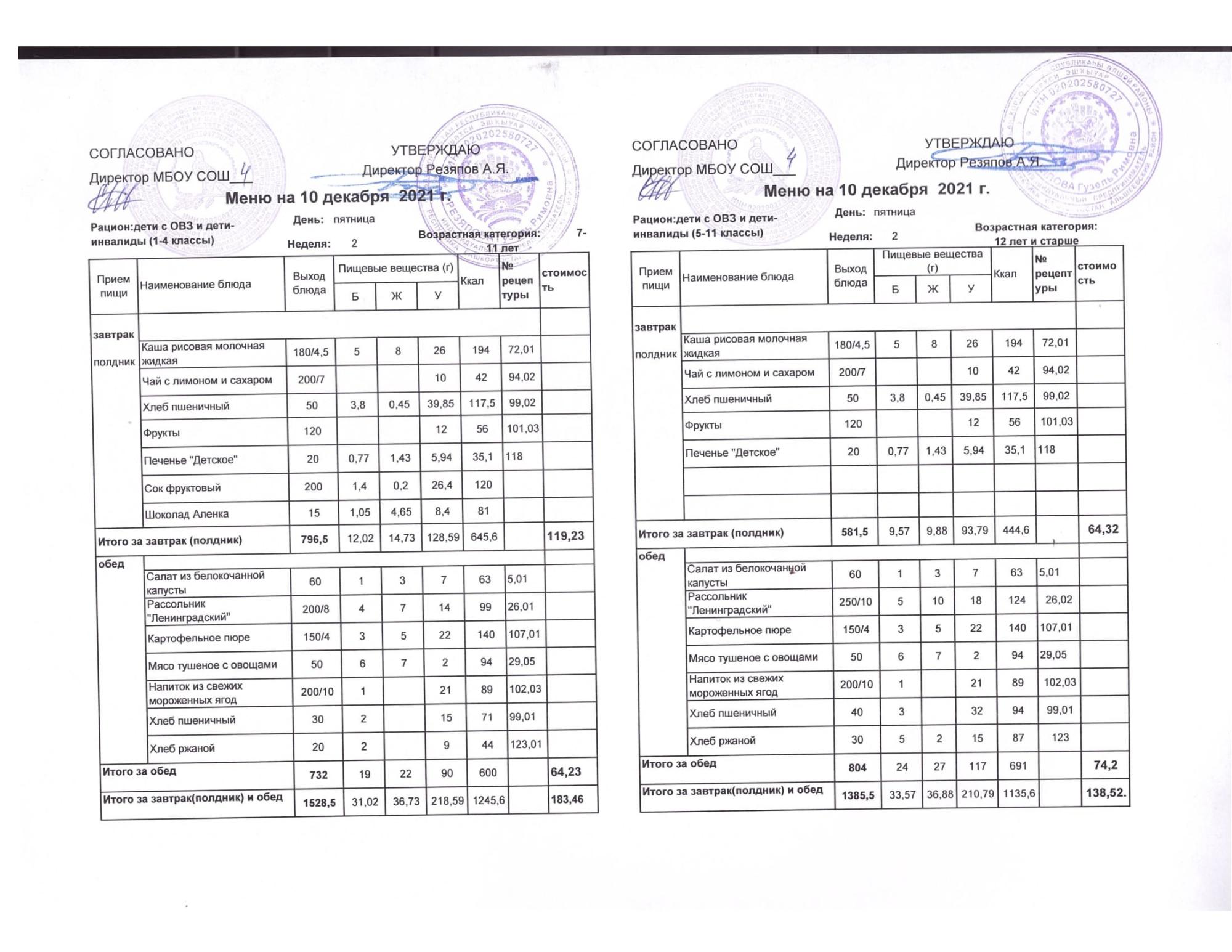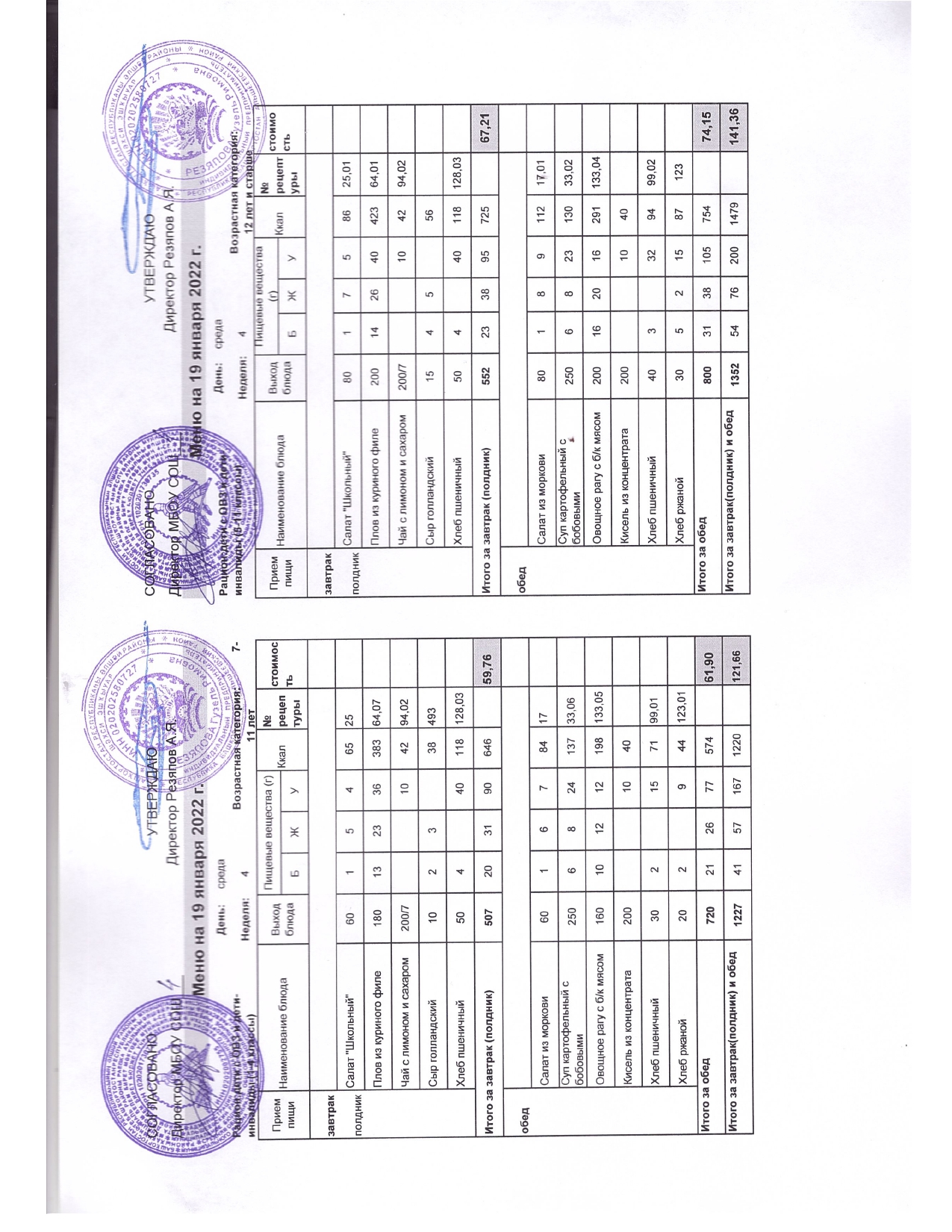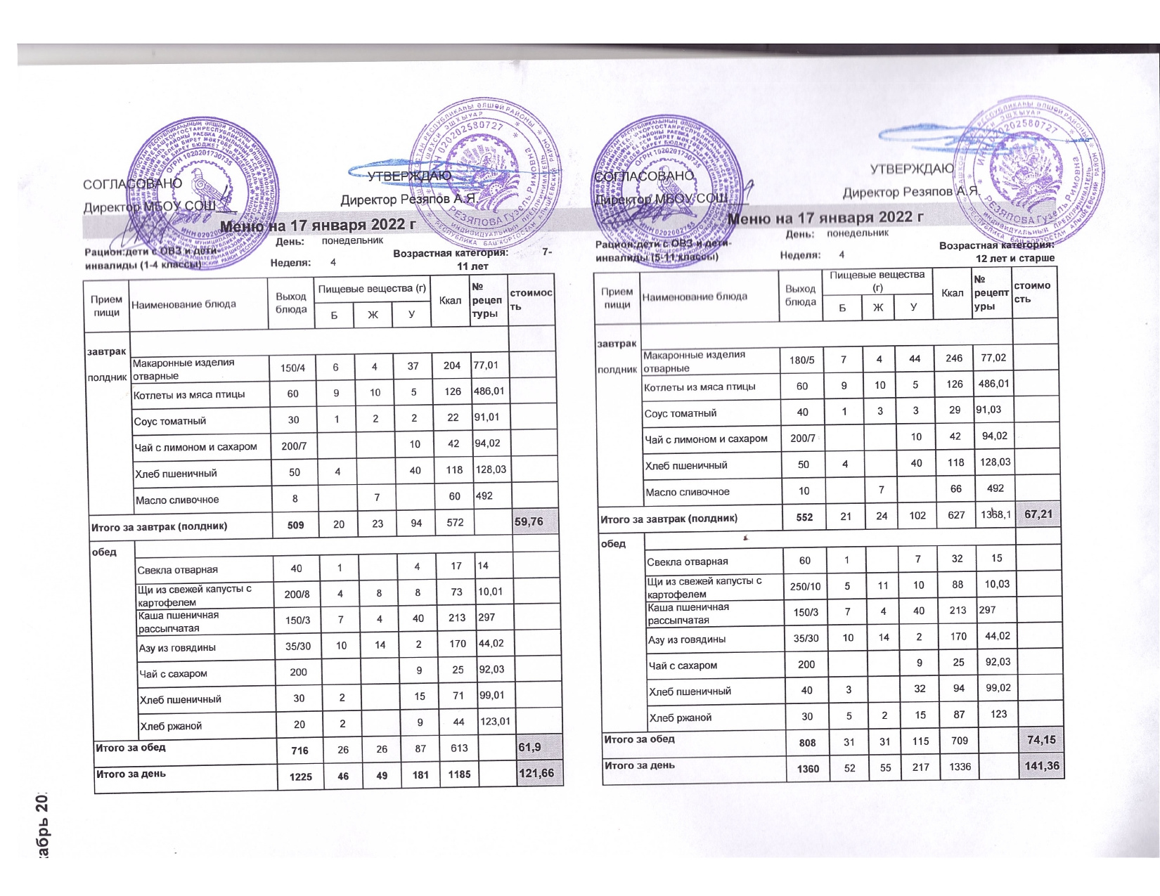 Стоимость школьного питания
