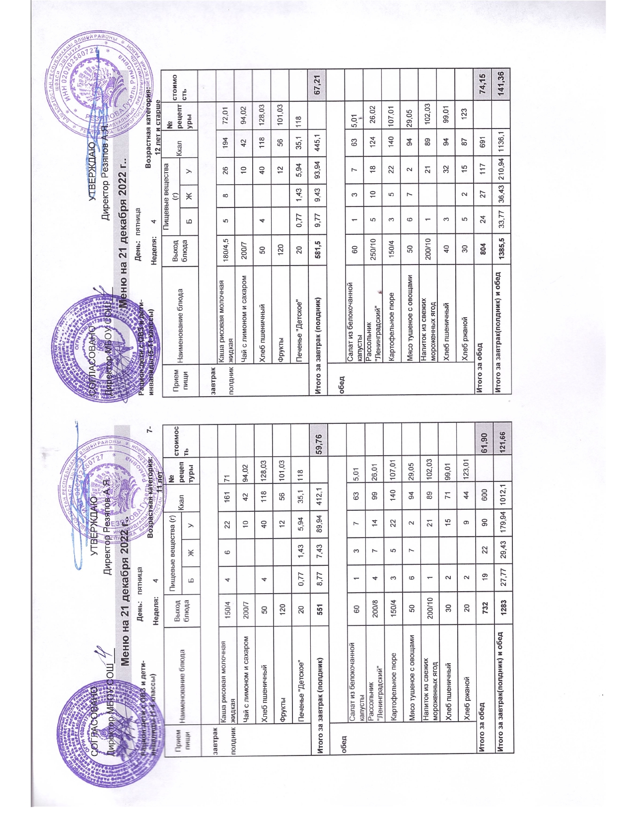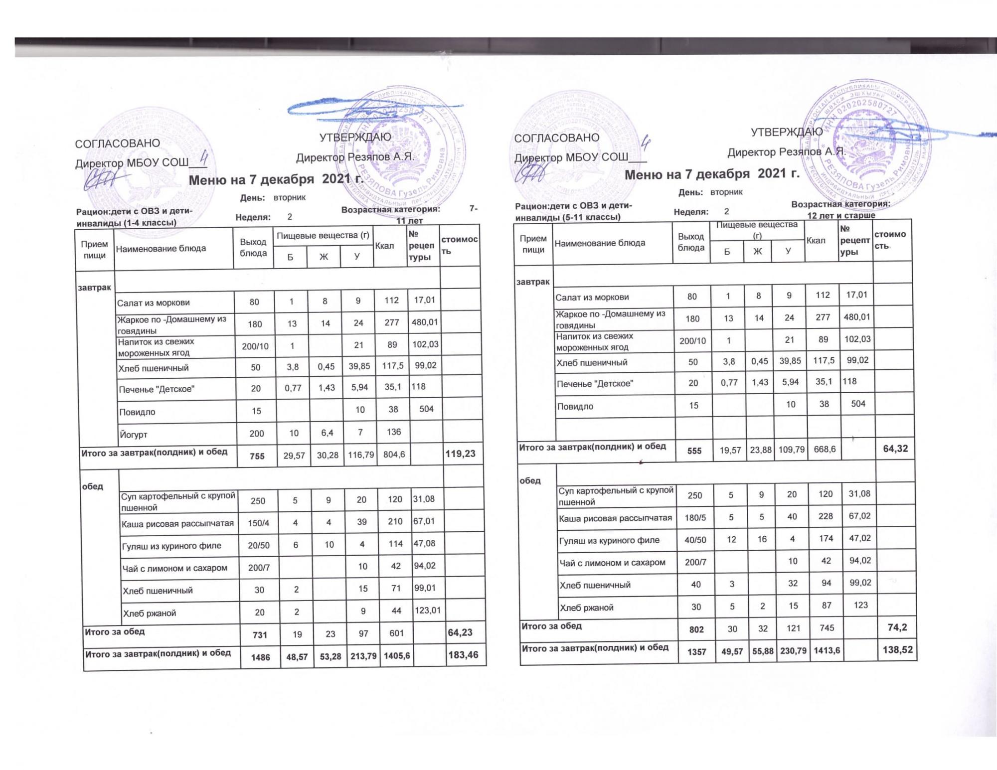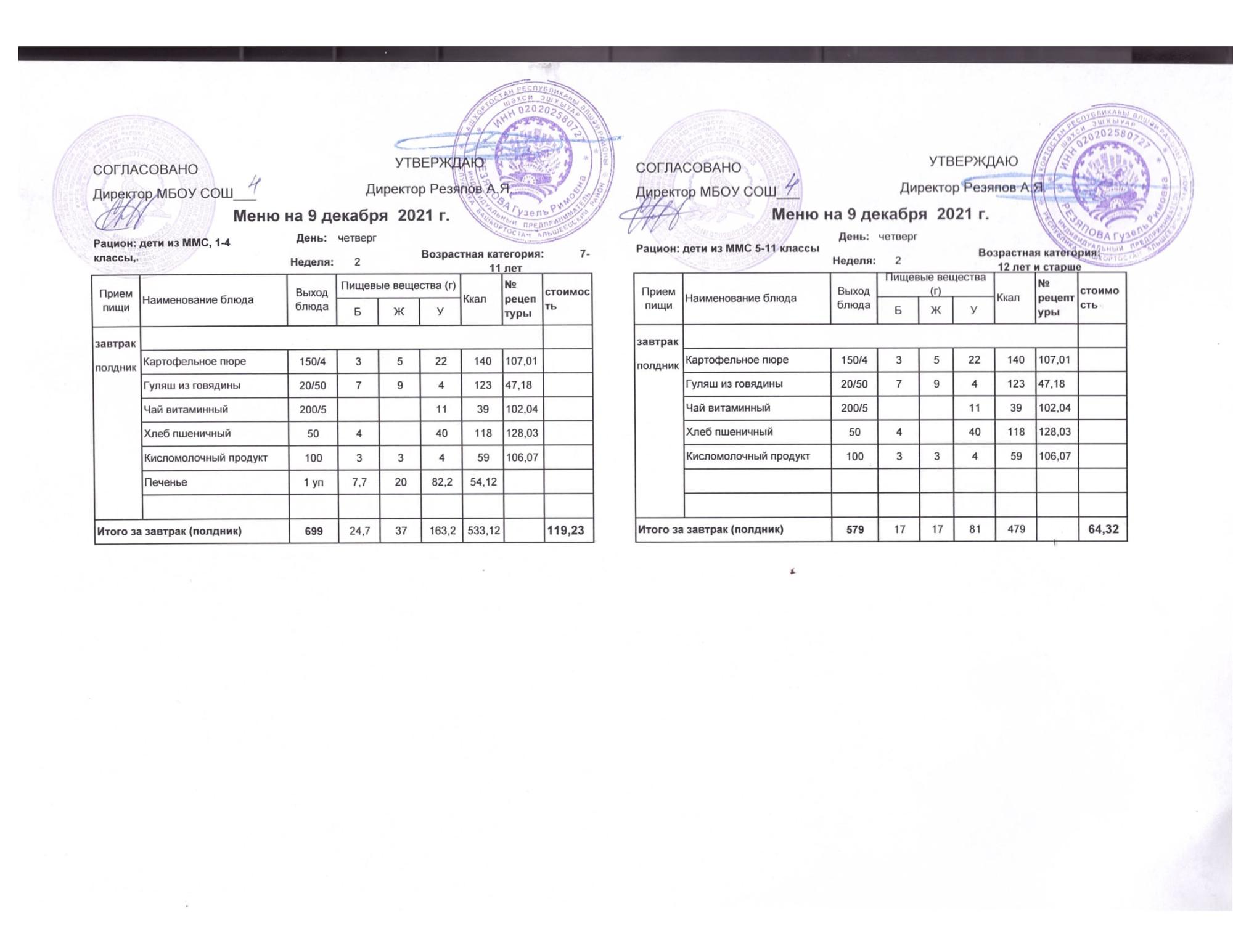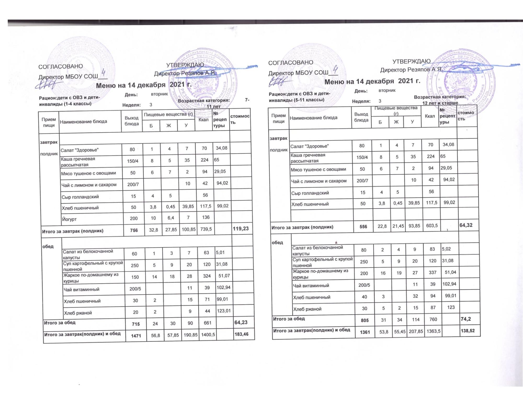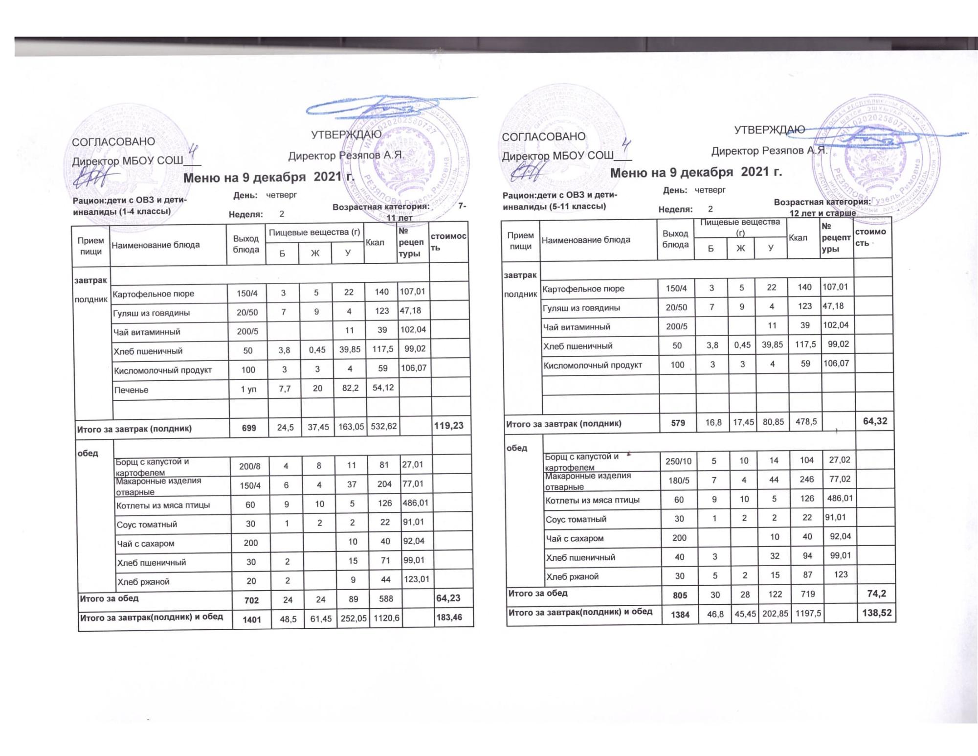 Стоимость школьного питания