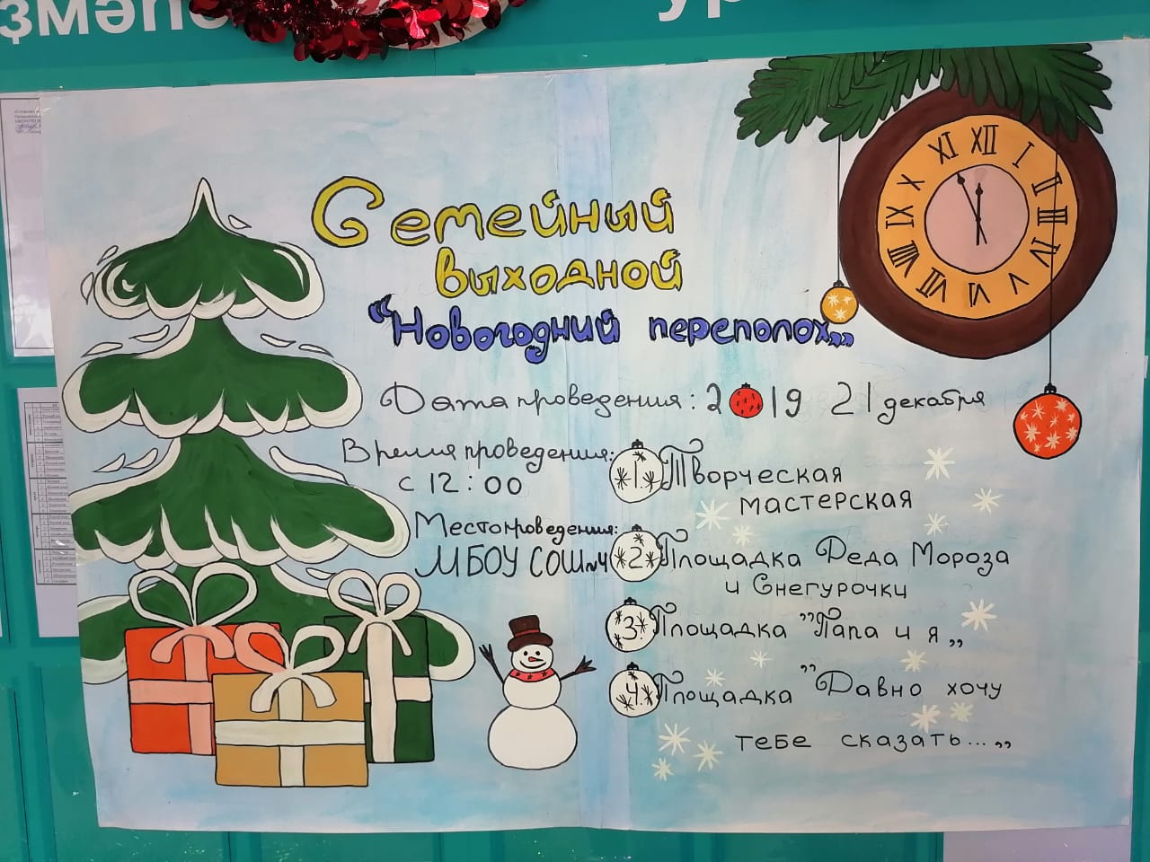 21 декабря 2019г. в школе прошел Семейный выходной "Новогодний переполох". Ребята с родителями приняли участие в различных мастер-классах, танцах. Дети рассказывали стихи Деду Морозу и Снегурочке.