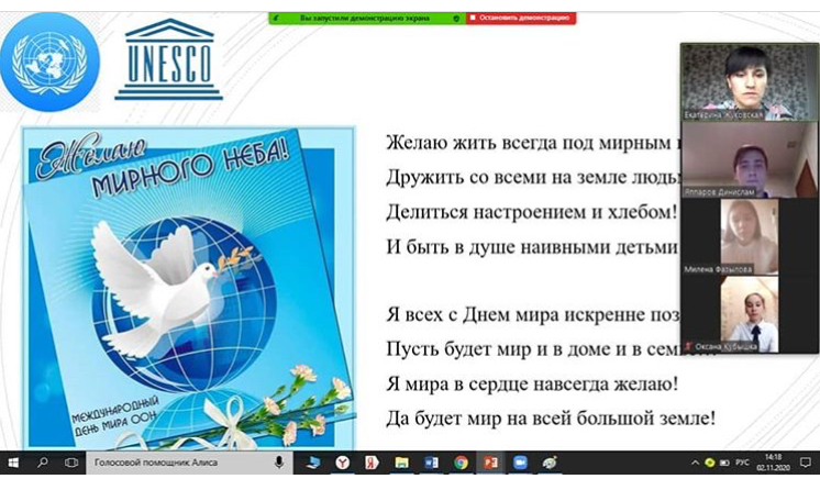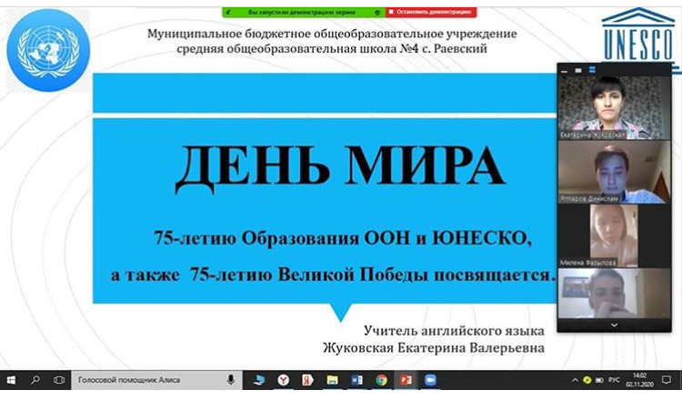 Учитель английского языка Жуковская Е.В. провела мероприятие "День мира" с обучающимися школы в дистанционном формате, посвященное 75-й годовщине образования ООН и ЮНЕСКО, а также приуроченное к 75-летию Великой Победы