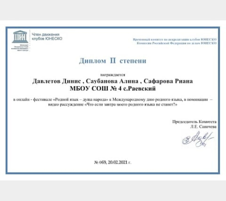 Команда МБОУ СОШ №4 с.Раевский заняла 2 место в Республиканском онлайн-фестивале "Родной язык — душа народа", посвященном Международному Дню родного языка